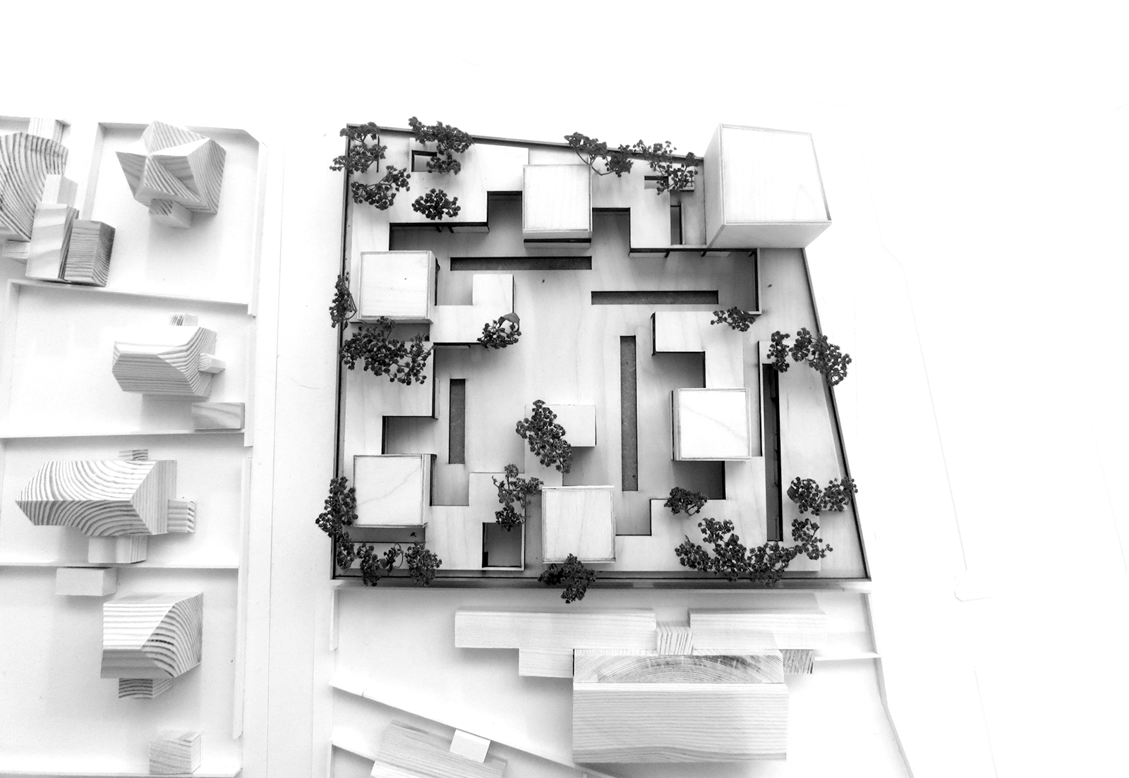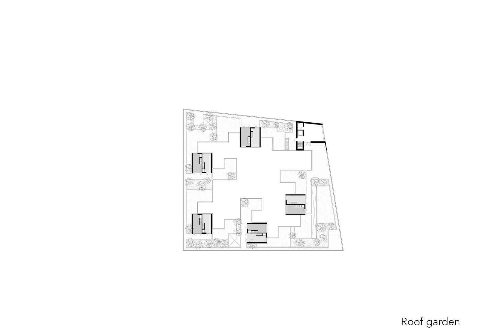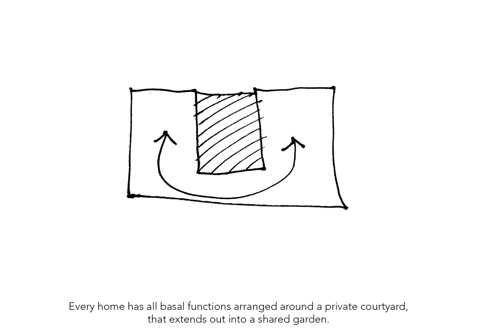 The concept suggests a gradual shift in privacy, through overlapping zones, from the secluded private homes, via the shared space, to the public space. Every home has all basal functions arranged around a private courtyard, that extends out into a shared garden. Niches function as transitions between the private and the social spaces.